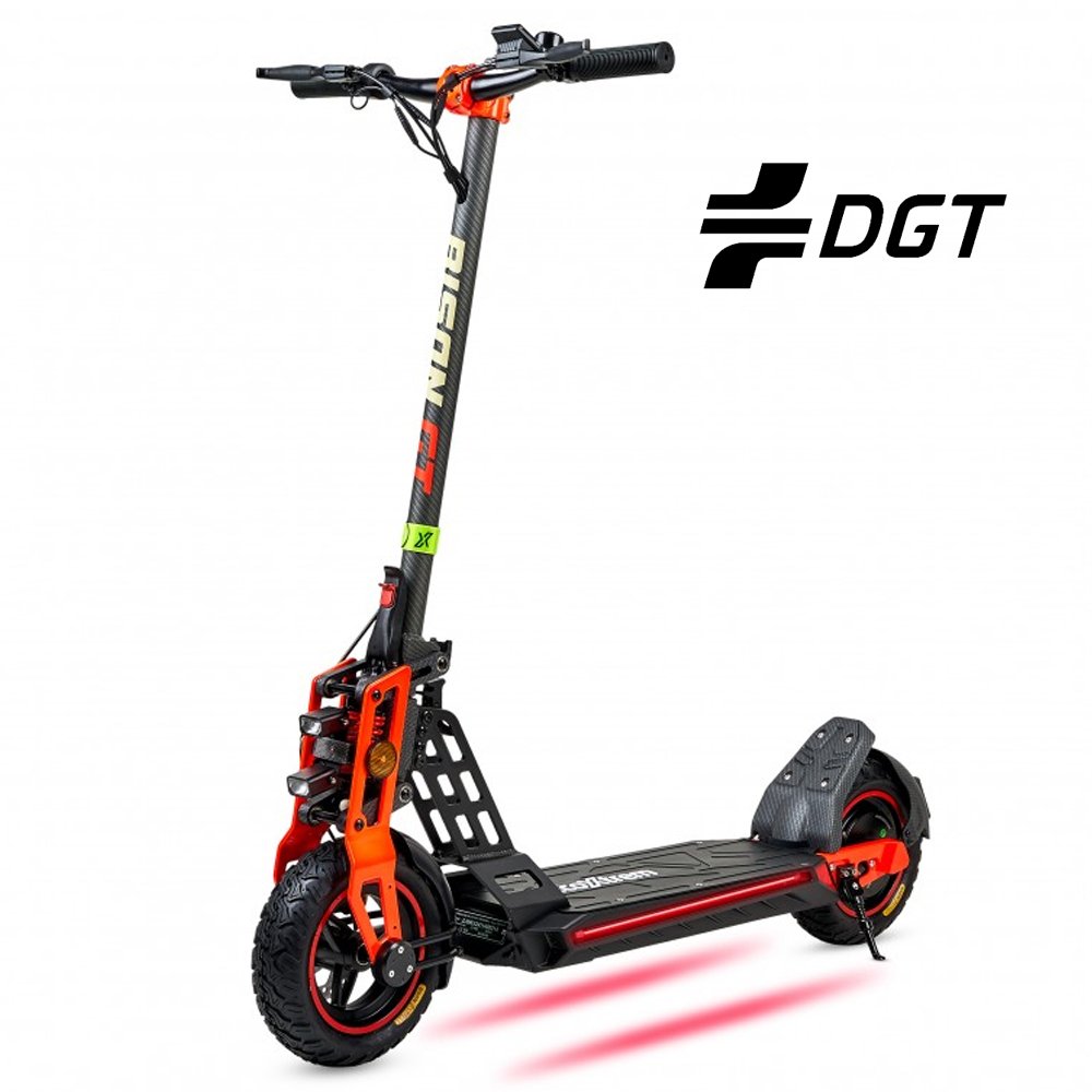 El Bison GT DGT Carbon Design es un patinete eléctrico homologado por la DGT, con motor de 800W nominal, batería de 48V 13Ah, hasta 40 km de autonomía, ruedas tubeless de 10”, frenos de disco y doble suspensión delantera, diseñado para ofrecer potencia, estilo y seguridad en cada trayecto.